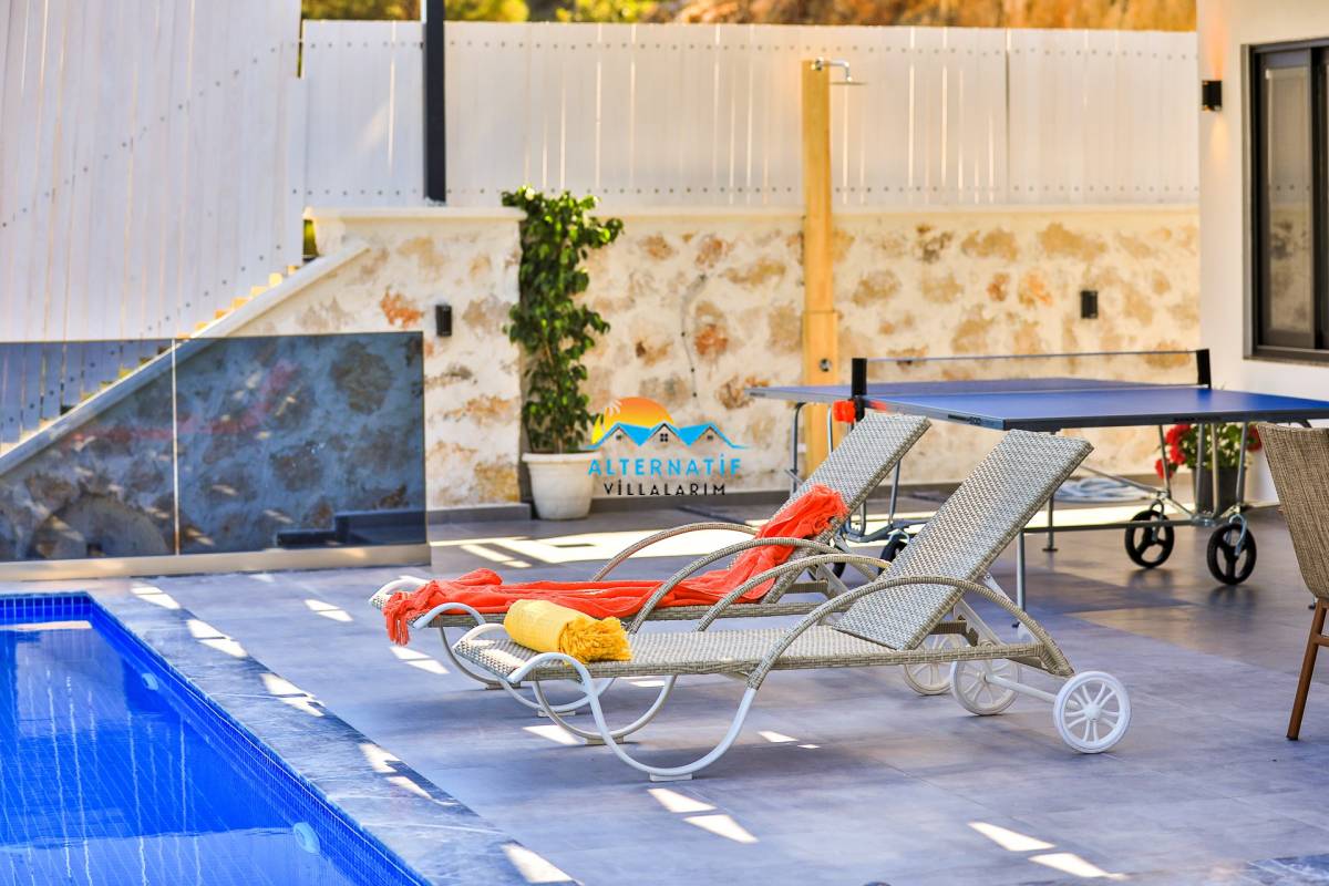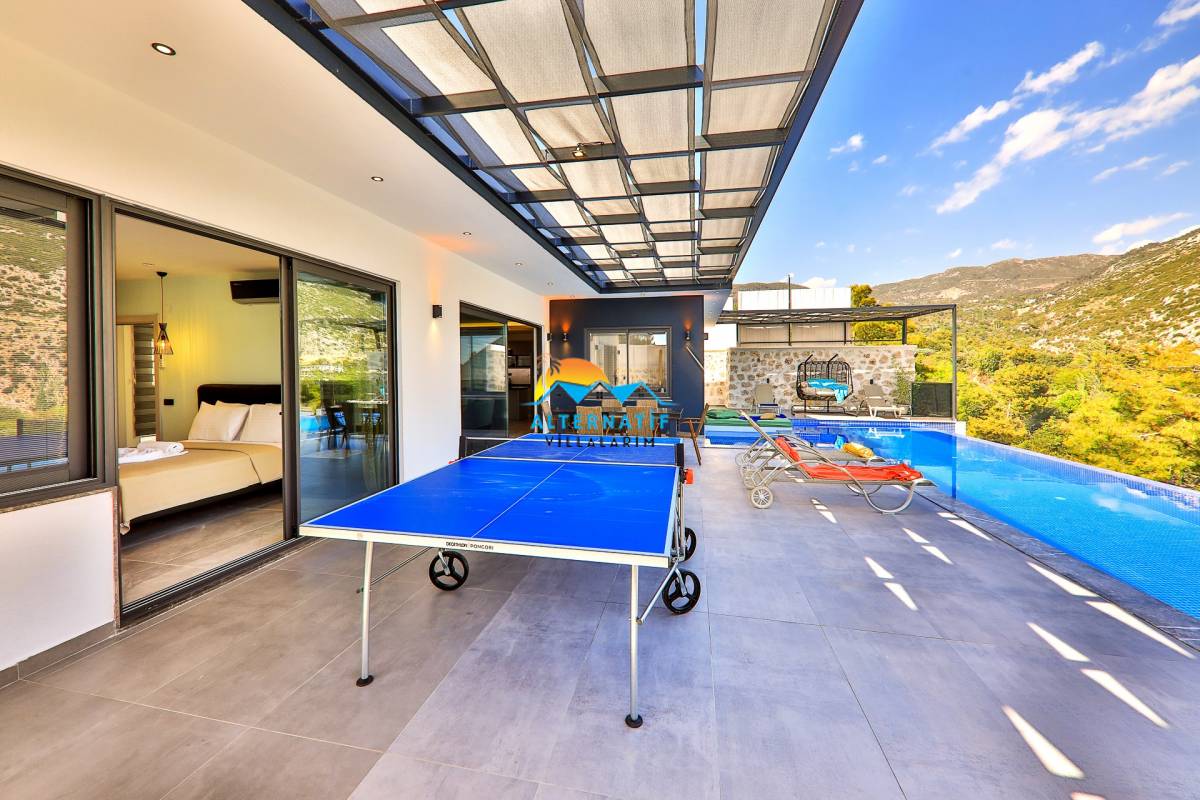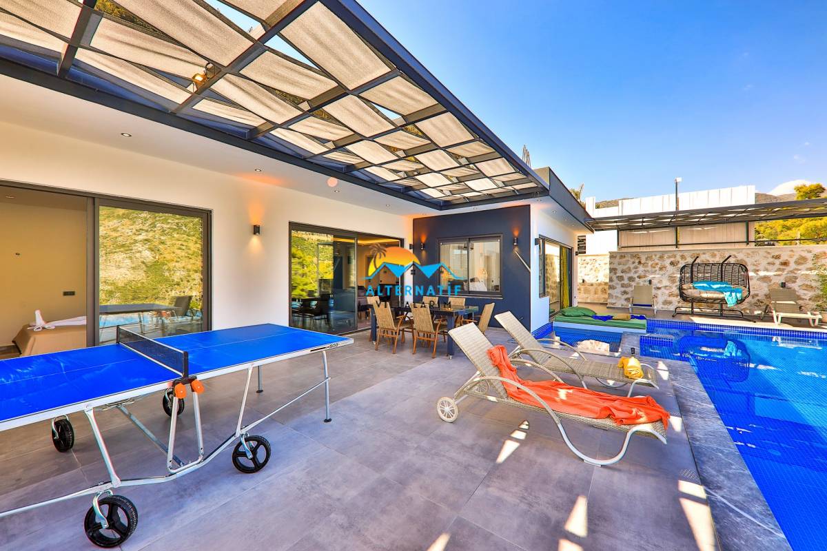 Şezlonglar, bahçe oturma grubu, salıncak, masa tenisi, yemek masası ve sandalyeleri bulunur.